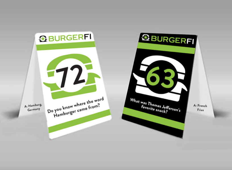 The project objective was to create table numbers for better efficiency for food runner to table service. The theme being 'How do we create something picture worthy or even souvenir worthy'. Various existing brands' table numbers were considered for initial concepting. Taking into consideration the textures and elements that make BurgerFi feel like 'BurgerFI' such as the signature green, the logo, the wood and industrial elements that are showcased in each establishment. Fun menu item trivia questions were considered, but didn't have complete brand ownership. The solve was informing the public on the eco-friendly side of BurgerFi that has always existed but was never truly marketed. This was the start of the 'Going Green Initiative' for BurgerFi.